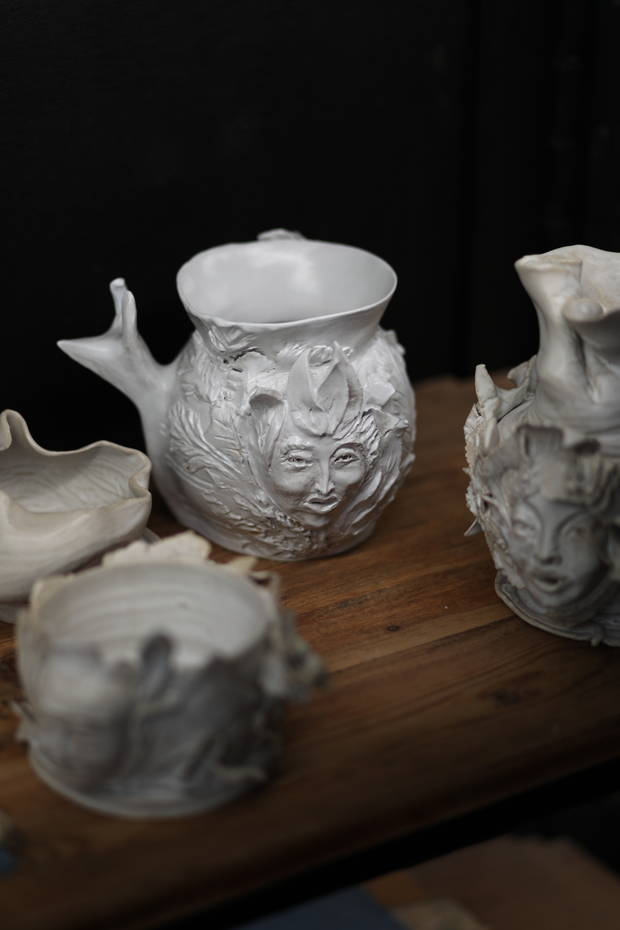Her sculpture unfolds through stoneware, where gesture remains instinctive and unrestrained. Forms emerge as fragments, assembled, disrupted, reconfigured, carrying traces of memory, bodies, and inner landscapes. Rejecting ornament, her sculptures exist as presences: raw, symbolic, and unresolved.
